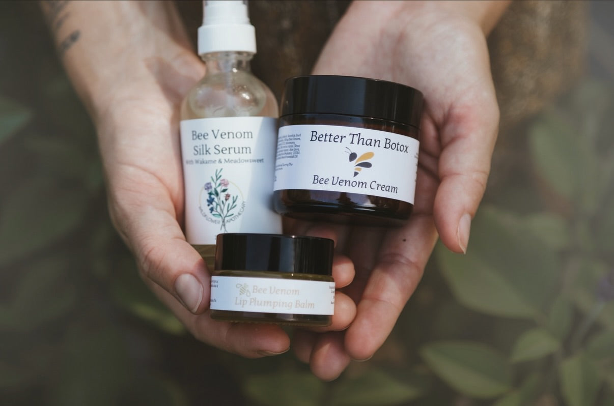 Our Bee Venom Products work to calm & even freeze muscle contractions, while helping to plump, firm & tighten the skin. Our Ethically Sourced Bee Venom is harvested by using the Pheromone & Glass Plate Method. This Pheromone is applied to a large glass plate and placed next to the hive. The Pheromone attracts the bees and stimulates them to sting the glass plate, ejecting their venom but stopping the loss of their stinger. This prevents their death and the bees go on their way unharmed. The venom is then dried, scraped & packaged. Truly an amazing process!